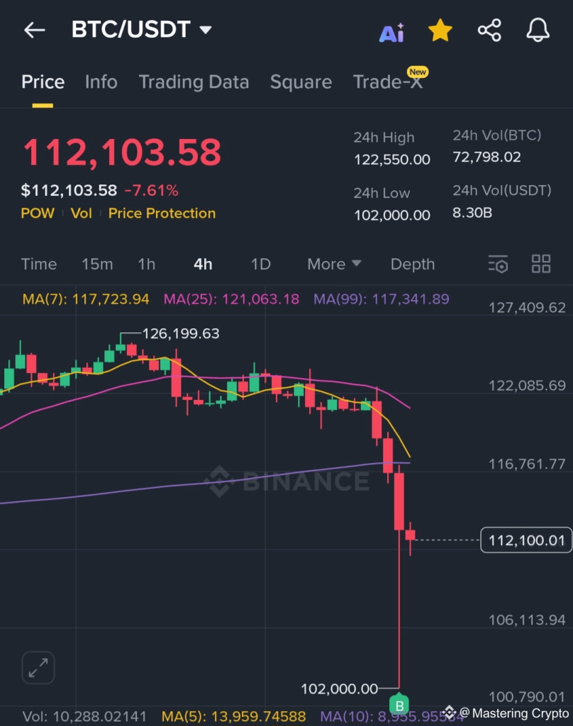 今天有是一个值得铭记的日子,10.11,超过160万人爆仓,近200亿。今天加密市场急剧下跌,数十亿在几个小时内被抹去。比特币从 $122,000 跌至 $102,000,而以太坊和主要山寨币下跌了 10–25%。这不是一次随机下跌——这是由全球政治、杠杆交易和投资者情绪变化引发的连锁反应。